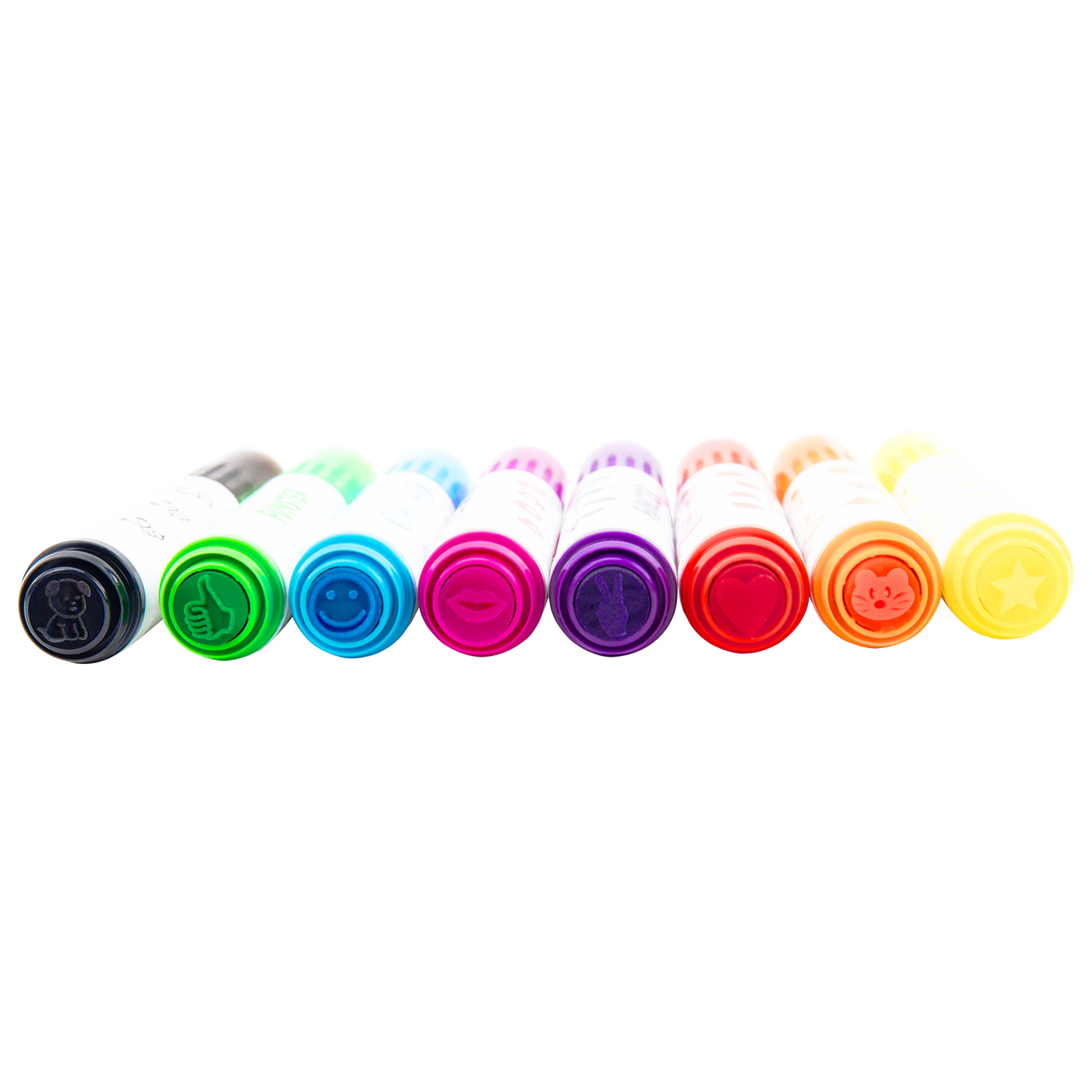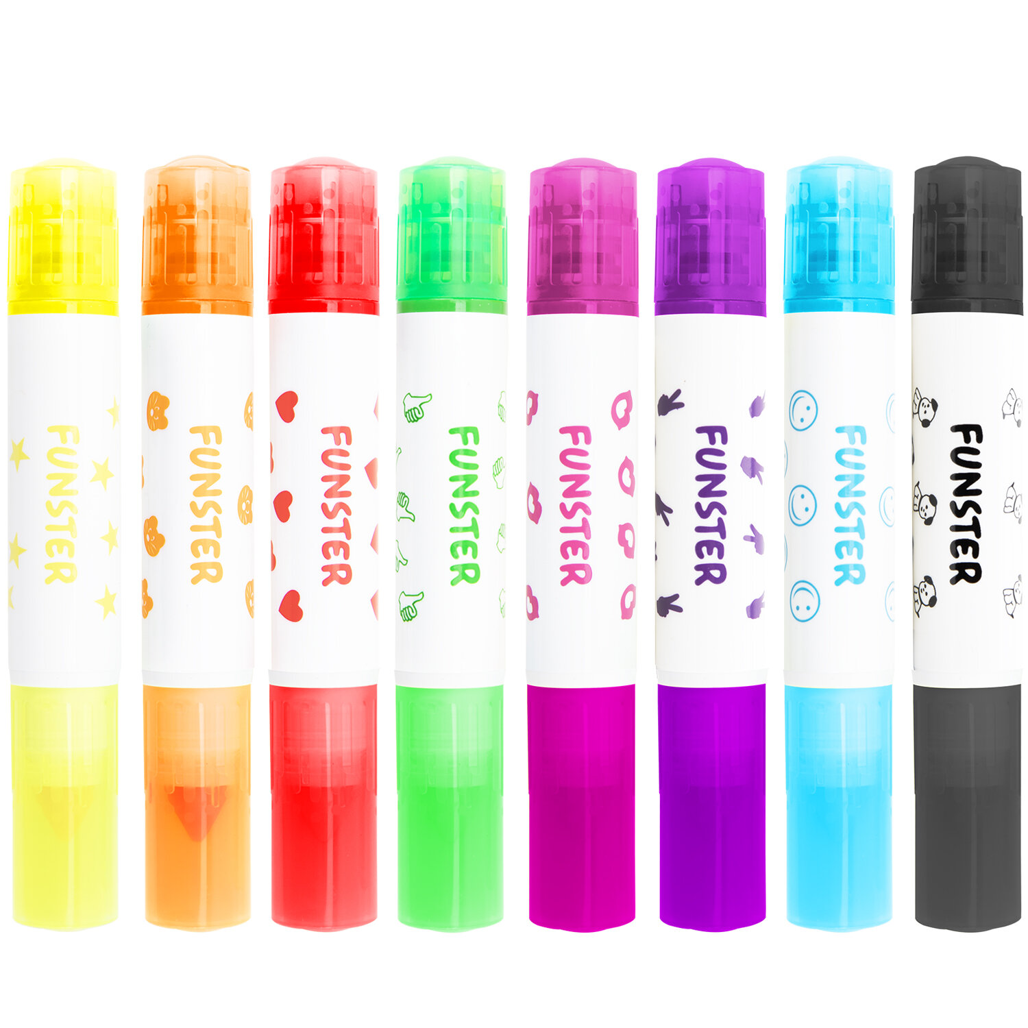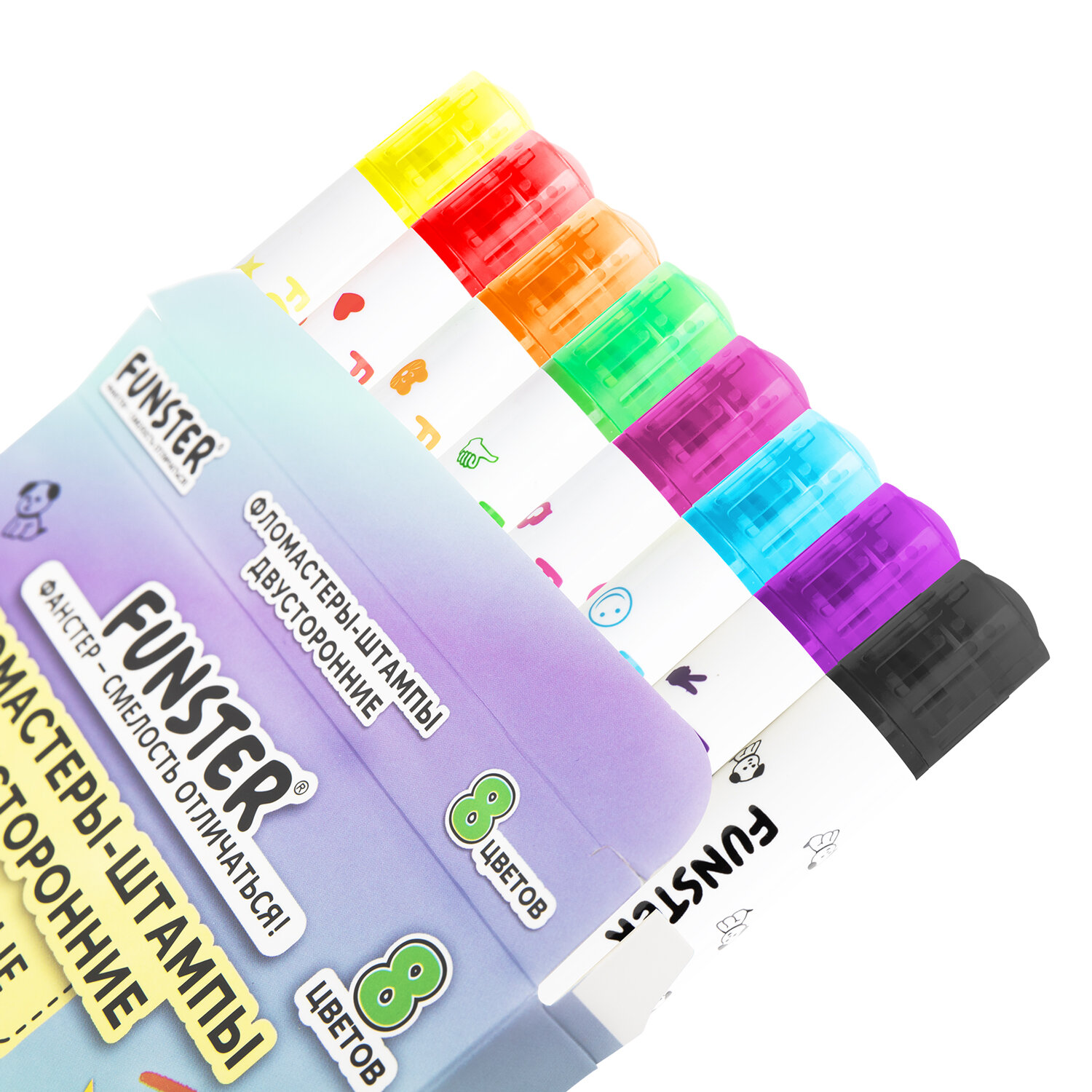 Фломастеры-штампы двусторонние FUNSTER помогут развить творческие способности у детей! Утолщенные двусторонние фломастеры имеют 2 вида наконечника: с одной стороны конической формы, с другой – наконечники-штампы с восьмью разными картинками.